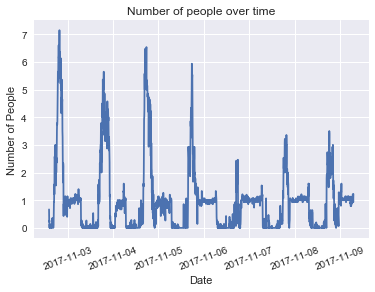 After collection over 55,000 data points, I loaded the file into a Jupyter Notebook and used Pandas and matplotlib to try and gain some insights from the data. I binned the data into windows of 5 minutes and averaged all data points withing those 5 minutes to account for variations in the number of people that YOLO counted. I then plotted the data in two ways. One plot showed the average number of people over the course of a single data and the other showed the number of people over the course of the week that I ran the experiment. It’s pretty cool how the data turned out– there is noticeable periodicity in the week graph and you can clearly see the number of people vary with closing hours and dinner time in the day graph. Pretty neat, if you ask me.